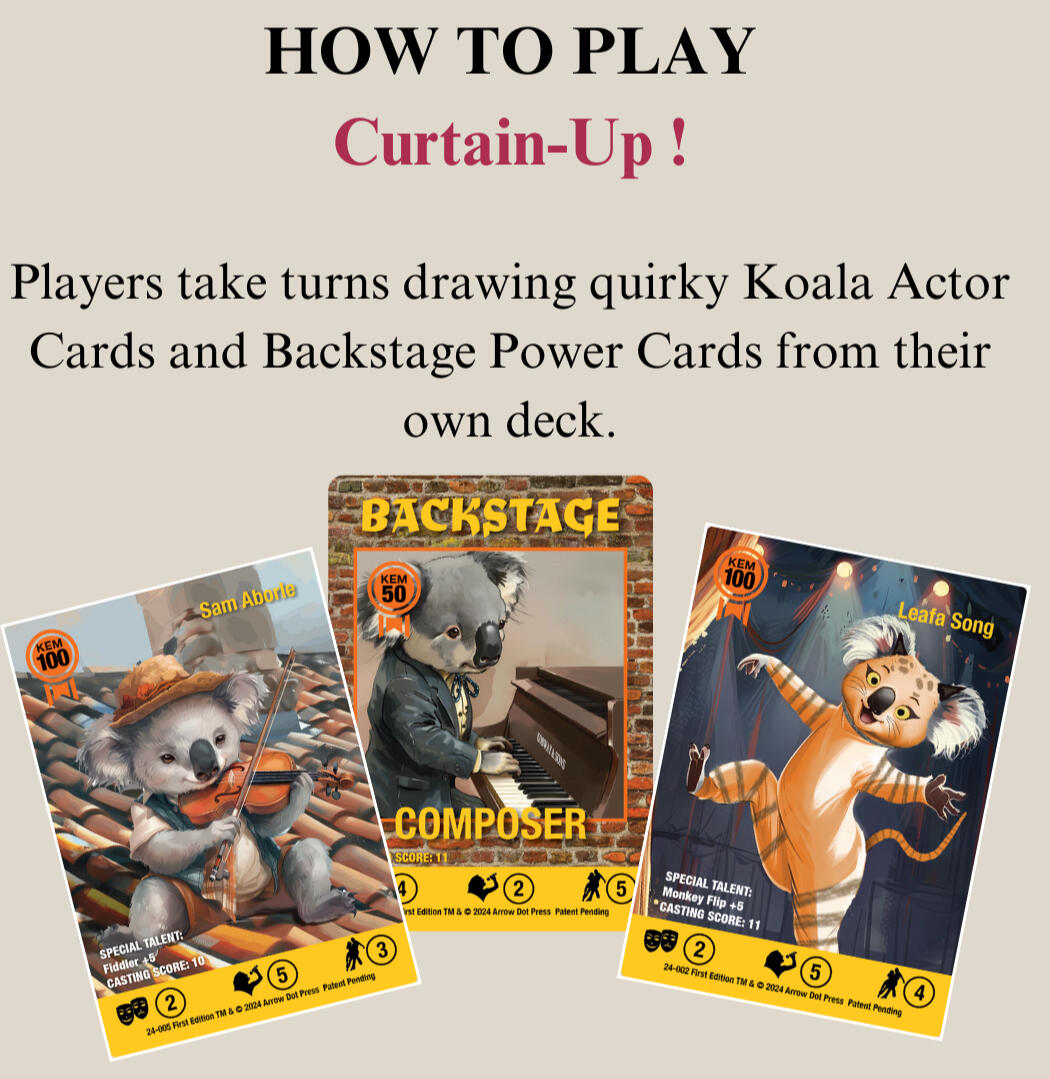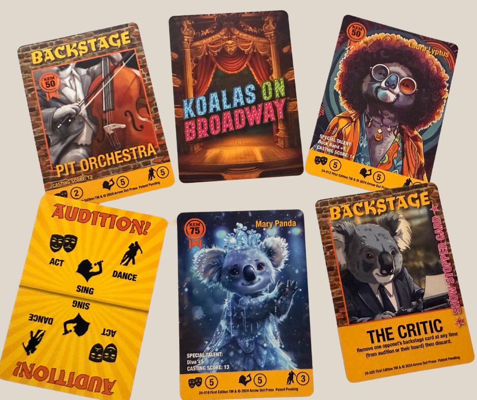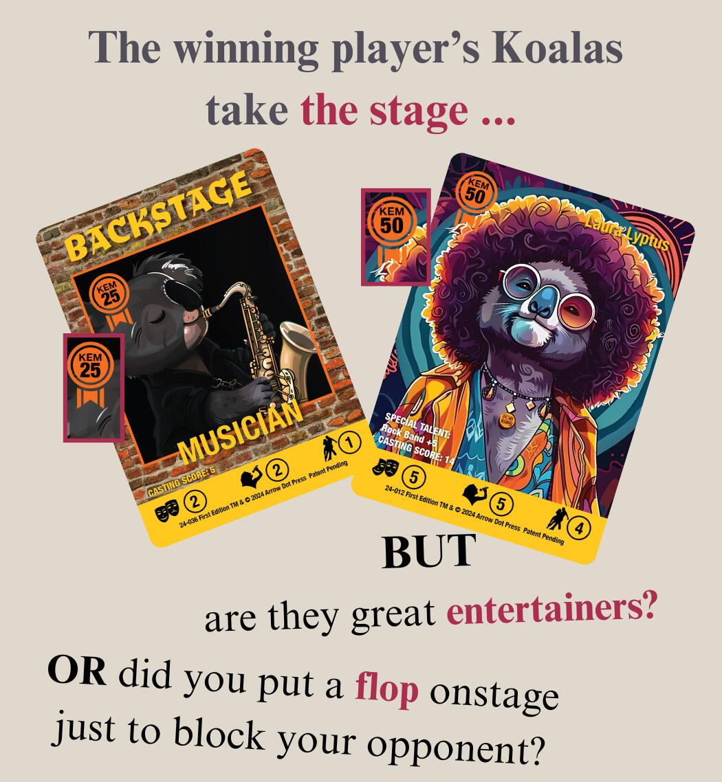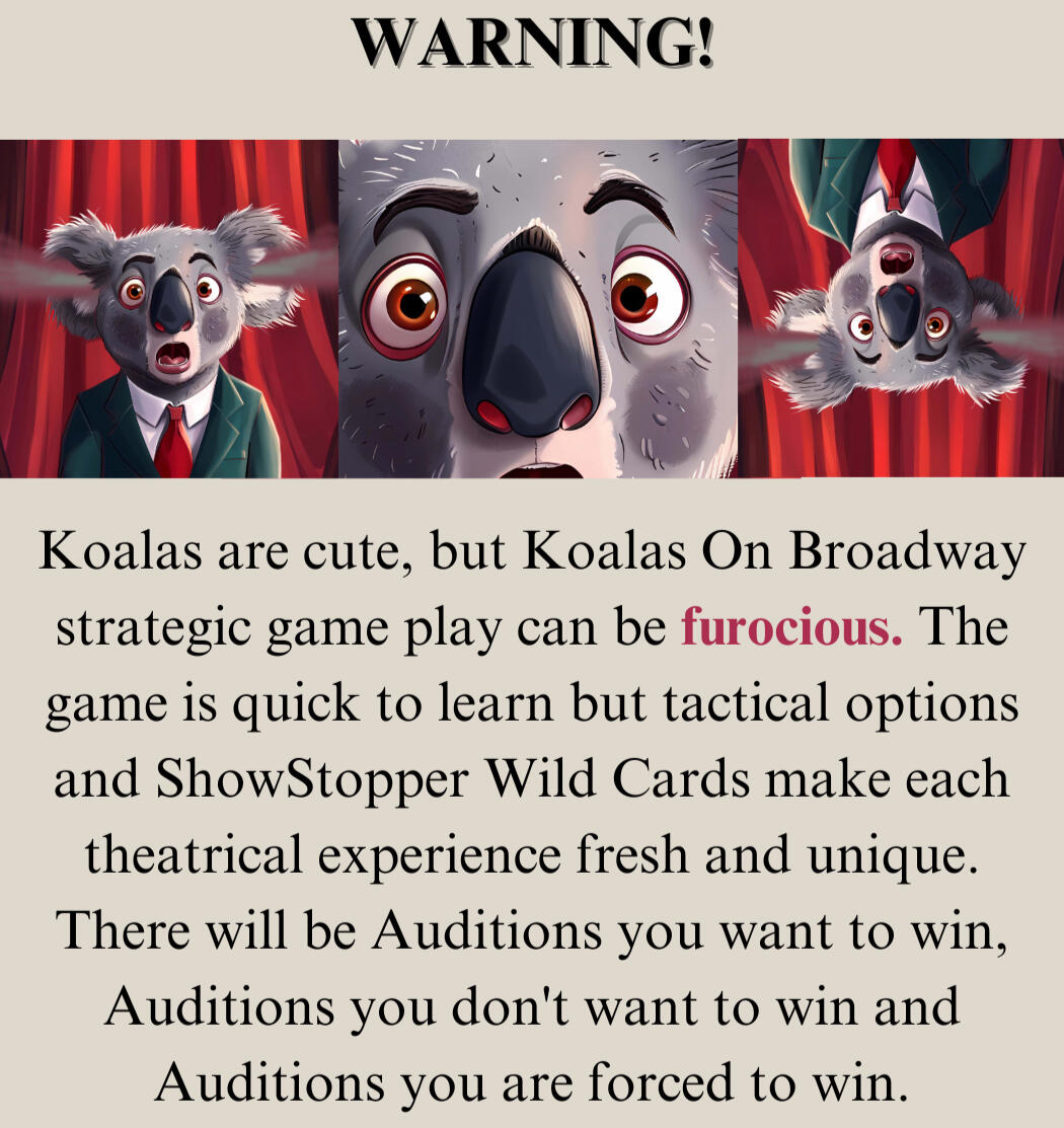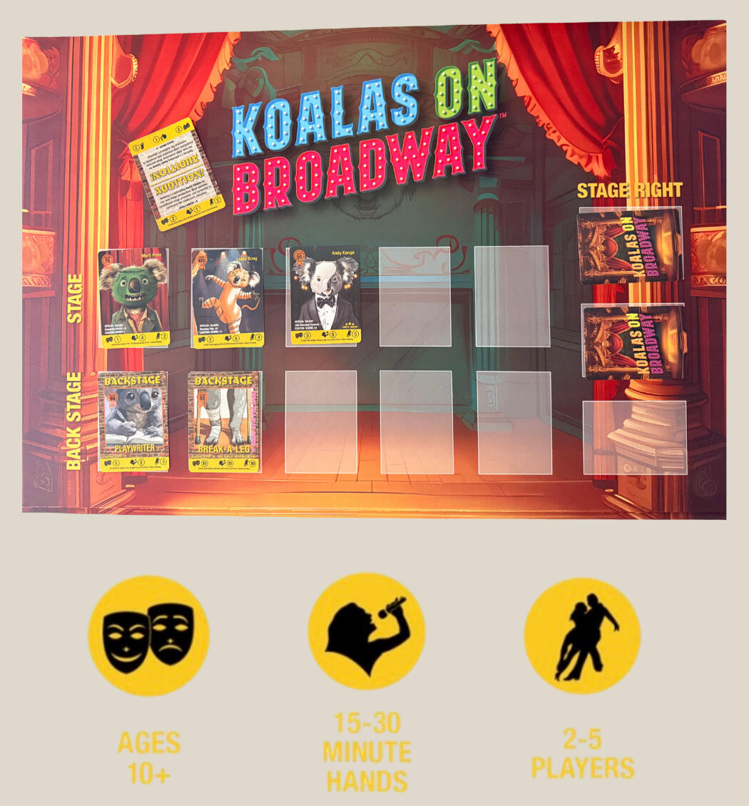 Koalas On Broadway is the First Edition of an exciting TCG deck-building card game where strategy meets theatrical flair. Ages 10 and up for 2-5 players. Pick it up and your favorite game store and set the stage for endless fun!